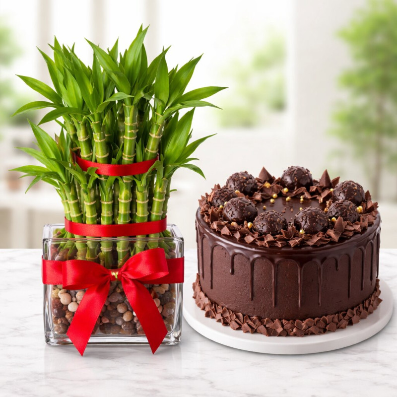 The elegant bamboo arrangement enhances any space with its fresh green charm, making it an ideal gift for home, office, or special occasions. Complementing it is a rich and creamy cake, crafted to delight taste buds and make moments more memorable.