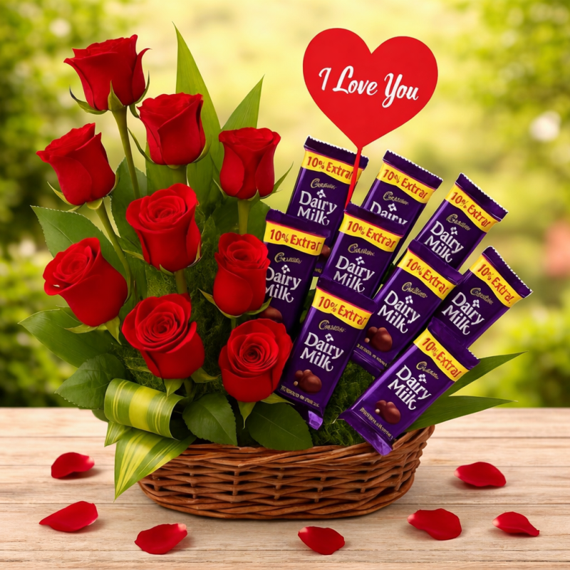 Express your deepest feelings with this beautifully crafted Sweetheart Love Surprise Basket. Featuring fresh red roses symbolizing love and passion, paired perfectly with delicious Cadbury Dairy Milk chocolates, this elegant wicker basket makes a heart-touching gift for your special someone. Accented with an adorable “I Love You” heart topper, it’s an ideal surprise for Valentine’s Day, anniversaries, birthdays, or romantic moments. A perfect blend of sweetness and romance that speaks straight from the heart.